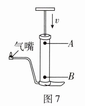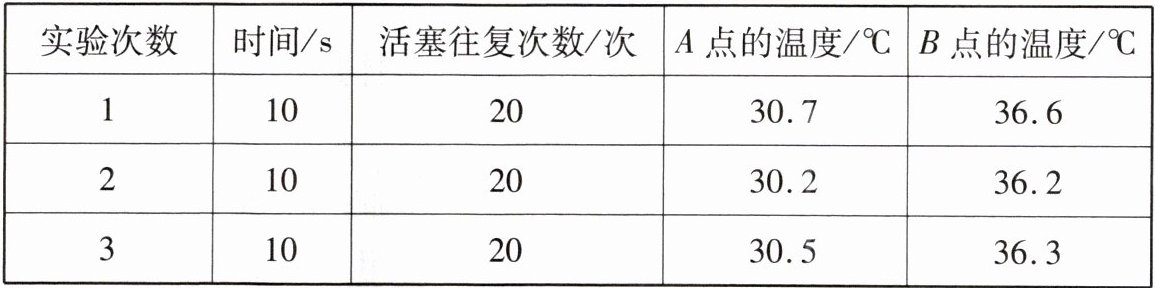于是他设计了实验进行探究:用打气筒给气压不足的篮球打气,10 s内使活塞在筒内往复运动20次,立即测出图7中A、B两个测温点的温度;待打气筒外壁温度降至室温(25℃)后,放出篮球中的部分气体,使其内部气压与打气前相同,重复上述操作,实验数据记录如下表。