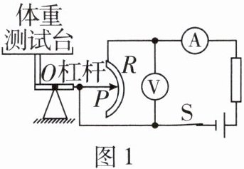 2. 图1是一个体重测试仪的工作原理图(弹簧未画出),电源电压保持不变,电阻片的电阻为$R$,滑片$P$和杠杆相连。所测体重增大时,体重测试台下降,杠杆绕$O$点旋转,体重表的示数变大。下列说法正确的是(