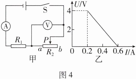 5. 如图4 - 甲所示的电路中,定值电阻的电阻$R_1 = 10\ \Omega$,滑动变阻器的最大电阻为$R_2$,电源电压保持不变。闭合开关$S$,当滑片$P$从$b$端移动到$a$端的过程,电压表示数$U$与电流表示数$I$的关系图像如图4 - 乙所示。求: