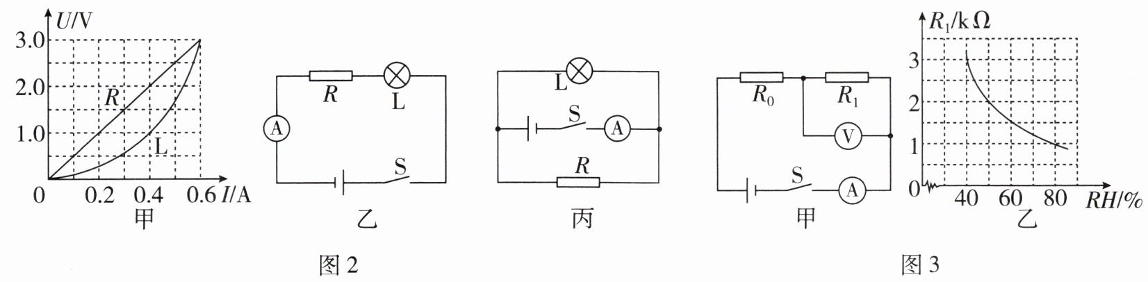 4. 小亮设计了一款湿度表,其电路原理图如图3 - 甲所示,电源电压恒为$15\ V$,定值电阻的电阻$R_0 = 500\ \Omega$,湿敏电阻的电阻$R_1$随空气湿度($RH$)的变化关系如图3 - 乙所示。已知人体感觉比较舒服的空气湿度范围是$40\% \sim 60\%$,下列说法正确的是(
