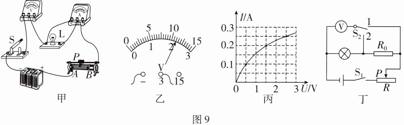 (选填“$A$”或“$B$”)端移动。(4)根据实验数据绘制的小灯泡的$I - U$关系图像如图9 - 丙所示。由图像可知: