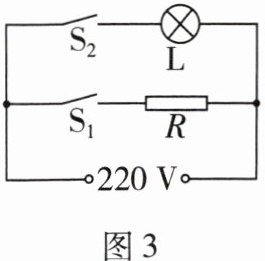 6. 物理与生活 某消毒柜具有高温消毒和紫外线杀菌功能,其简化电路如图 3 所示,发热电阻的电阻 R 为 110 Ω,紫外线灯 L 的规格为“220 V 80 W”,不计灯丝的电阻变化。闭合开关 S₁、S₂后,消毒柜正常工作,下列说法不正确的是(
