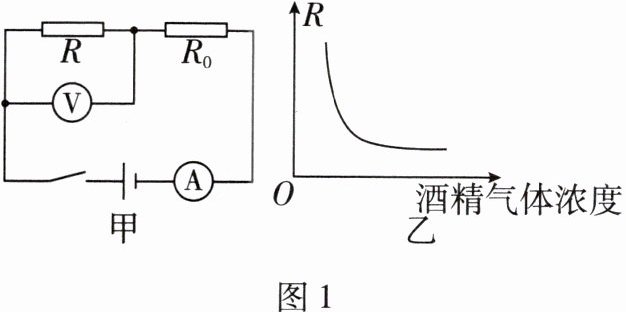 1. 饮酒后驾驶机动车会严重危害公共安全,属违法行为。图 1 - 甲是某厂家设计的酒精测试仪的原理电路图,定值电阻的电阻为 $ R_0 $,气敏电阻的电阻 $ R $ 与酒精气体浓度的关系如图 1 - 乙所示,电源电压恒定不变。闭合开关后,当酒精气体浓度增大时,下列说法正确的是(