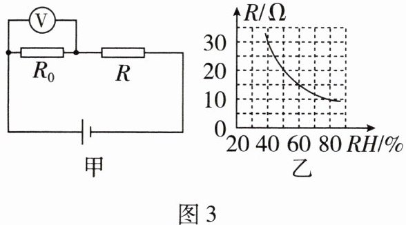 3. “回南天”是深圳春天常见的现象。“回南天”期间空气湿度 $ RH $ 较大,为了测量空气湿度,某同学设计了一个湿度计(表盘由电压表改装而成),其原理如图 3 - 甲所示,定值电阻的电阻为 $ R_0 $,电压表的测量范围为 $ 0 \sim 3 $ V,电源电压恒为 5 V,湿敏电阻的电阻 $ R $ 随空气湿度 $ RH $ 变化的关系图像如图 3 - 乙所示。把该湿度计放在空气湿度为 40% 的环境中,电压表的示数为 2 V。求: