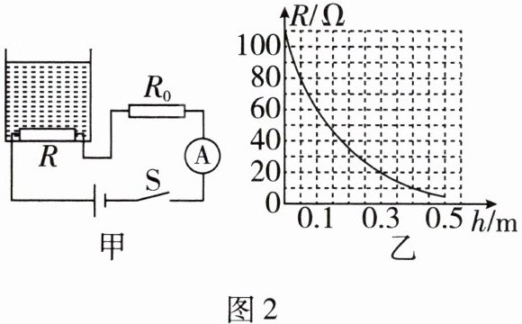2. 物理与生活 图 2 - 甲所示为某同学设计的一个可以显示汽车油量的电路,其中电源电压恒为 12 V,定值电阻的电阻 $ R_0 = 10 \Omega $,电流表的测量范围为 $ 0 \sim 0.6 $ A。压敏电阻位于油箱底部,其厚度不计,其电阻 $ R $ 随汽油深度 $ h $ 变化的关系图像如图 2 - 乙所示。求: