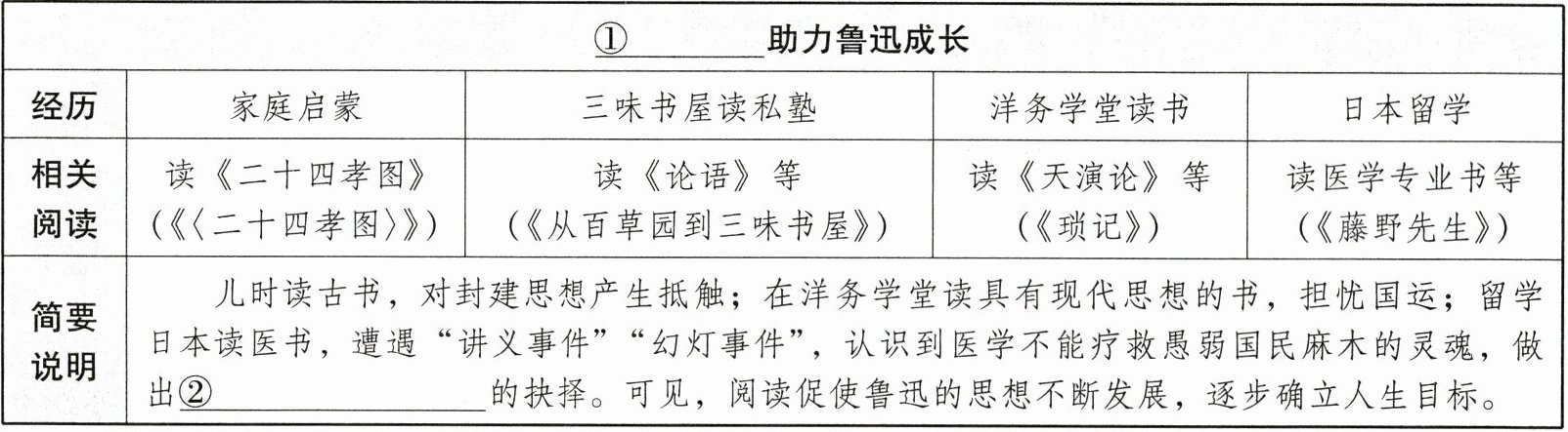 │ 简要说明 │ 儿时读古书,对封建思想产生抵触;在洋务学堂读具有现代思想的书,担忧国运;留学日本读医书,遭遇“讲义事件”“幻灯事件”,认识到医学不能疗救愚弱国民麻木的灵魂,做出②______的抉择。可见,阅读促使鲁迅的思想不断发展,逐步确立人生目标。 │