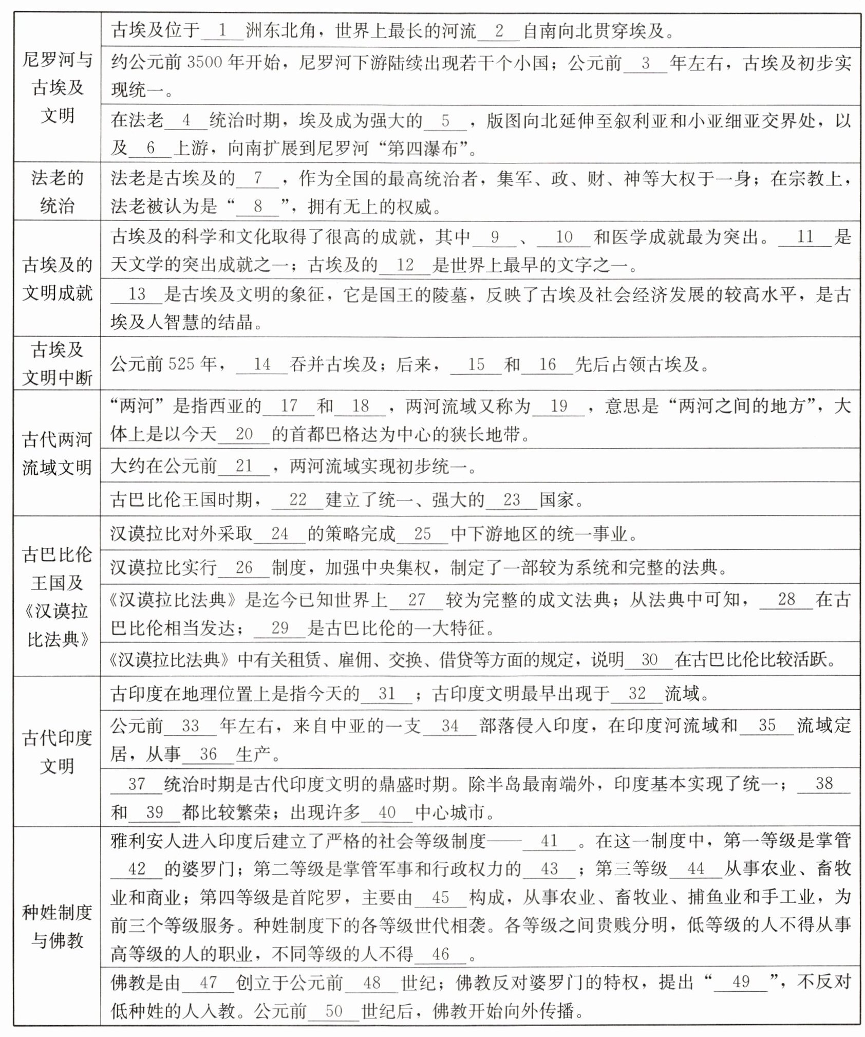 1. 非;2. 尼罗河;3. 3100;4. 图特摩斯三世;5. 军事帝国;6. 幼发拉底河;7. 国王;8. 神之子;9. 天文学;10. 数学;11. 太阳历;12. 象形文字;13. 金字塔;14. 波斯帝国;15. 亚历山大帝国;16. 罗马帝国;17. 幼发拉底河;18. 底格里斯河;19. “美索不达米亚”;20. 伊拉克;21.24世纪;22. 汉谟拉比;23. 奴隶制;24. 各个击破;25. 两河流域;26. 君主专制;27. 第一部;28. 奴隶制度;29. 家庭奴隶制;30. 商品经济;31. 南亚次大陆;32. 印度河;33.1500;34. 游牧;35. 恒河;36. 农业;37. 孔雀王朝;38. 农业;39. 工商业;40. 工商业;41. 种姓制度;42. 祭祀;43. 刹帝利;44. 吠舍;45. 被征服居民;46. 通婚;47. 乔达摩·悉达多;48.6;49. 众生平等;50.3。
