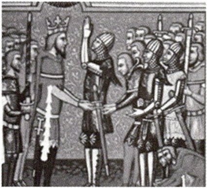 5. 下图是缔结封君封臣关系的仪式,封君封臣制在8世纪末已规范化,封臣先行“臣服礼”。到后来,宣誓臣服就是为了获得(