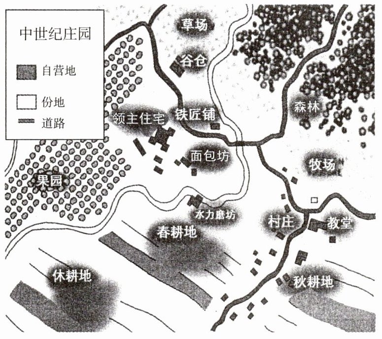 材料二 庄园领地上有农田、牧场、森林和水源,其设施除了领主住宅与农奴房舍之外,通常还有教堂、磨坊、面包坊、铁匠作坊等。庄园内最肥沃的田地由农奴定期无偿耕作,收成全部归领主,剩下的地是农奴的生活来源。农奴需上缴家禽、鸡蛋、肉、酒等实物地租;需向领主缴纳人头税、结婚税等货币地租;需不定期为领主服兵役和从事筑路、建房等劳役,这些属劳役地租。有时为了调整庄园内部关系还设立庄园法庭。