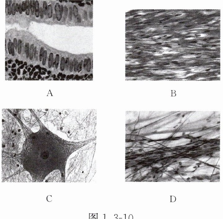 图 1.3 - 10 是某学生在显微镜下观察人体基本组织的永久玻片标本时看到的视野,请据图回答下列问题。