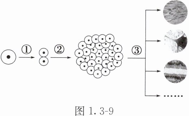 8. 图 1.3 - 9 所示是受精卵发生的一系列变化过程,请分析回答下列问题。