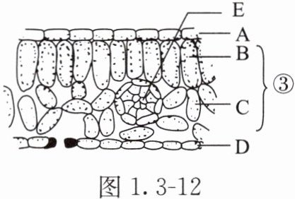 观察老鼠簕叶片横切面,图1.3 - 12是科研人员观察后绘制的结构图。图中,A和D是表皮细胞,属于保护