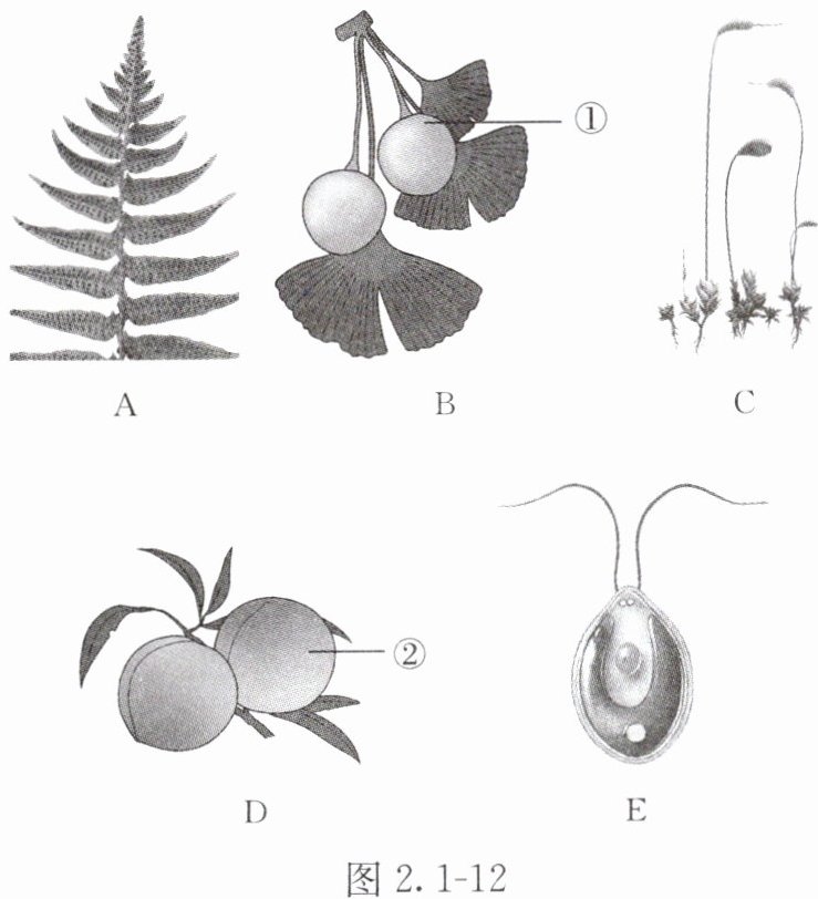7. 图 2.1 - 12 是五种生物的形态结构示意图,A 是贯众,B 是银杏,C 是葫芦藓,D 是桃,E 是衣藻。请分析回答下列问题。