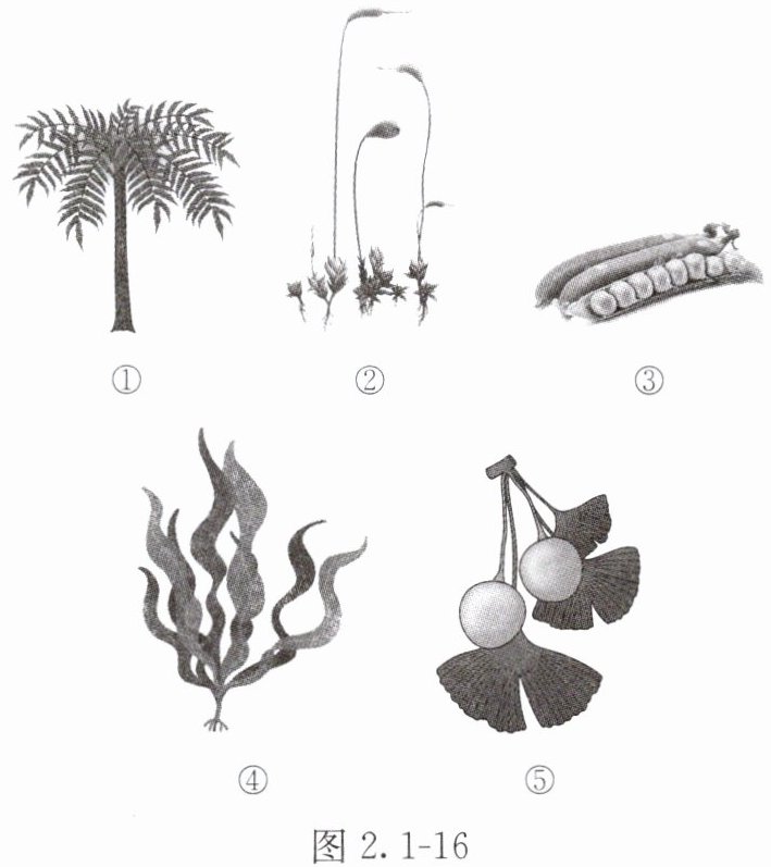 9. 葫芦藓、桫椤、银杏、豌豆和海带五种生物如图 2.1 - 16 所示,请据图回答下列问题。