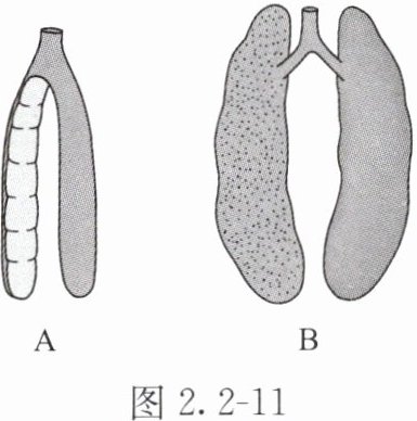 (3) 图 2.2 - 11 中 A 和 B 分别为中国大鲵和扬子鳄肺的结构示意图。与中国大鲵的肺相比,扬子鳄的肺更大,肺泡数量多,大大增加了气体交换的面积。而中国大鲵肺的结构简单,不能满足其对氧气的需求,还需要靠鳃和湿润的