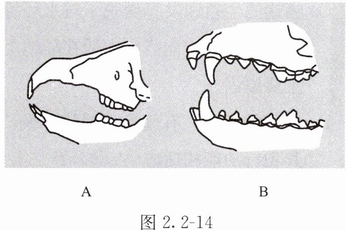9. 图 2.2 - 14 是兔和狼的牙齿结构图,请据图回答下列问题。