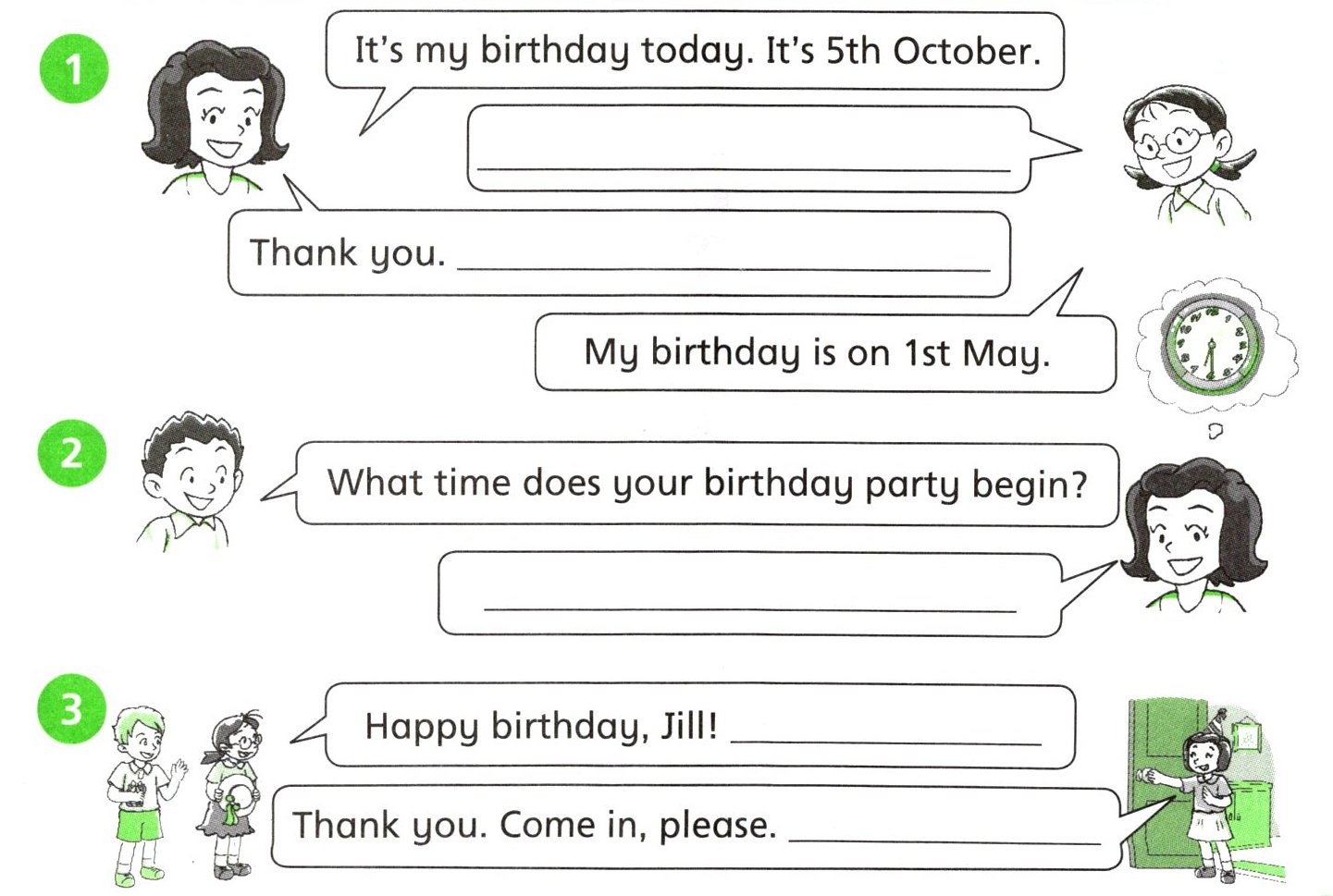 1. b Happy birthday, Jill! a When's your birthday, Kitty? 2. e It begins at half past six. 3. d Here is a yellow hat for you. c Let's have some fun.