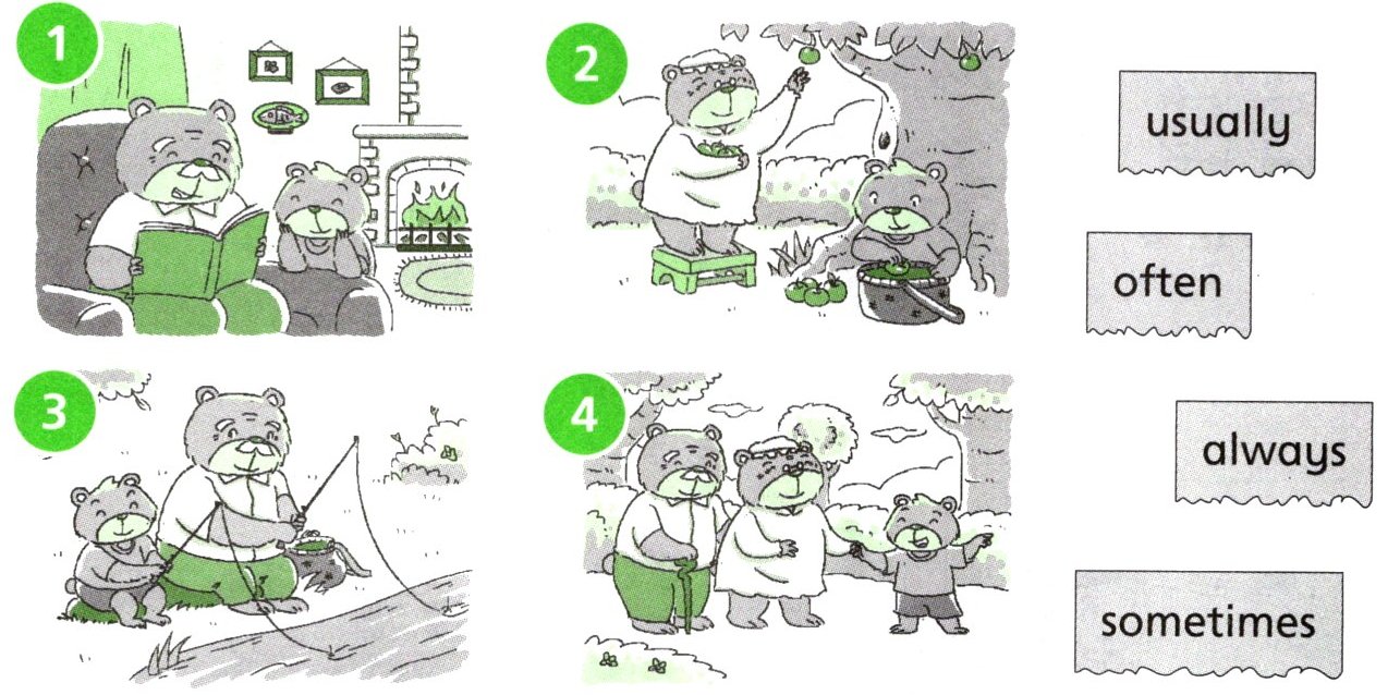 Little Bear lives with his grandparents. He always takes a walk with Grandma. He usually reads books with Grandpa. He often plays chess with Grandpa and picks fruits with Grandma. He sometimes goes fishing with Grandpa.