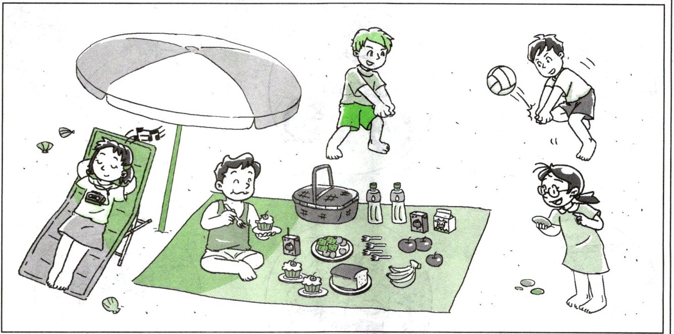 listening to music. Peter is eating a cake. Alice and Ben are playing volleyball. The girl with glasses is collecting stones. They enjoy the picnic very much.