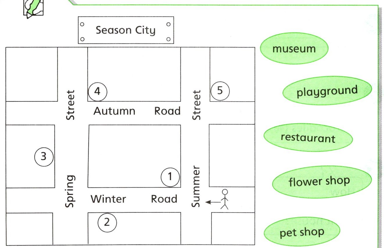 Are you hungry? Let's go to the restaurant. How do we get there? Go along Autumn Road. Walk straight and turn left at Summer Street. There is a restaurant on your right.