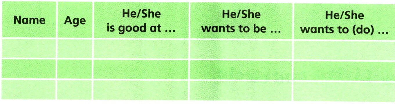 | Name | Age | He/She is good at … | He/She wants to be … | He/She wants to (do) … |