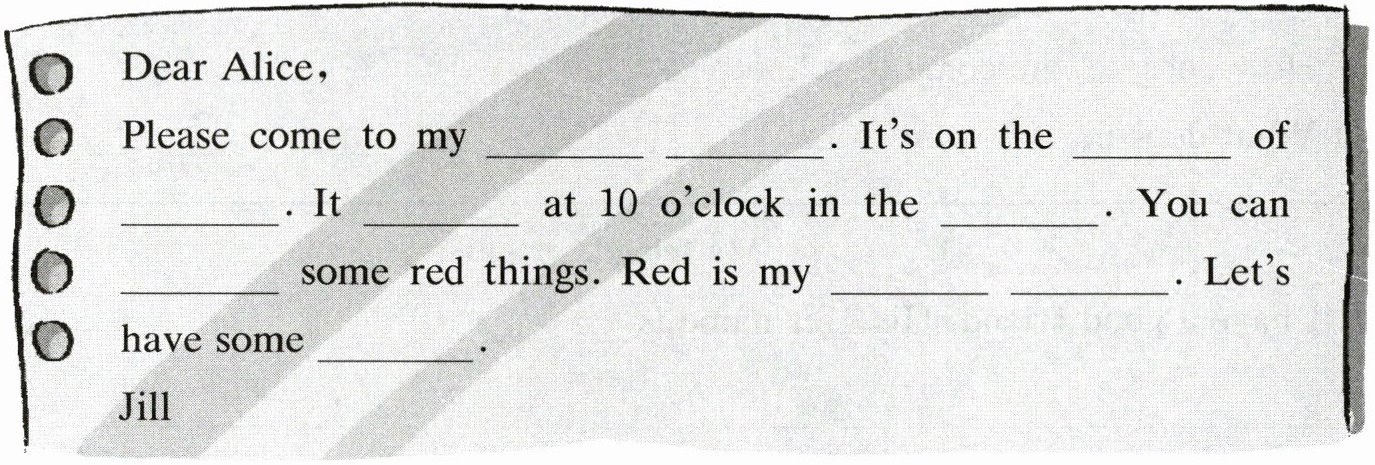 Dear Alice,Please come to my birthday party. It's on the third of March. It begins at 10 o'clock in the morning. You can bring some red things. Red is my favourite colour. Let's have some fun. Jill