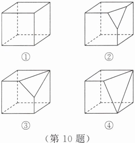 10. 【综合与实践】在数学活动课上,老师给出如图①所示的正方体,将该正方体截去一个角后,探究剩下的几何体有多少个面、多少条棱、多少个顶点。