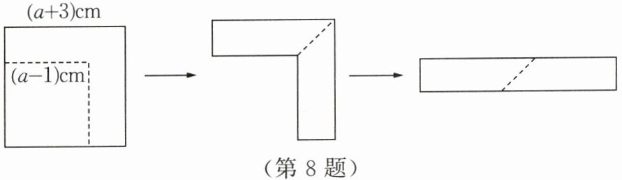 8. 如图,从边长为 $(a + 3)cm$ 的正方形纸片中剪去一个边长为 $(a - 1)cm$ 的小正方形 $(a > 1)$,剩余部分沿虚线又剪拼成一个长方形(不重叠也无缝隙),则该长方形的周长为(