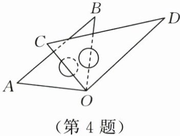 4. 一副三角尺按如图所示的方式放置,直角顶点O重合在一起,这副三角尺分别记作三角尺AOB和三角尺COD,∠AOB = ∠COD = 90°,∠A = 45°,∠D = 30°。同学们观察图形后得到下列结论:①∠AOC = ∠BOD;②∠AOD + ∠BOC = 180°;③∠AOC = 45°;④∠C = 2∠D = 60°。其中正确的结论有(
