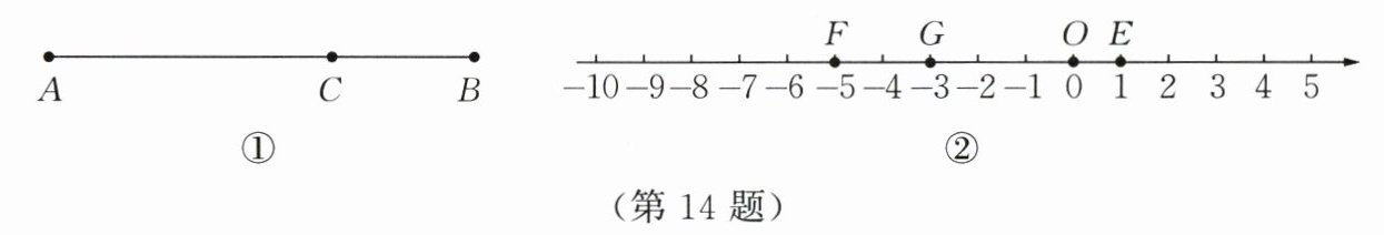 14. (13分)在数学课上,老师给出一个新定义:若点C在线段AB上,且BC = 2AC或AC = 2BC,则称点C是线段AB的“优点”,线段AC,BC称作互为“优点”伴侣线段。例如,在图①中,线段AB的长度为9,点C在AB上,AC的长度为6,则点C是线段AB的一个“优点”。