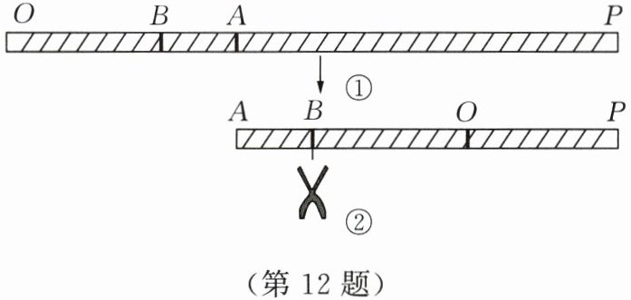 12. 如图①,线段OP表示一条拉直后长度为20 cm的细绳,点A和点B在线段OP上,OA:AP = 2:3,OB:BP = 3:7。固定A点,将线段OA折向AP,折后OA重叠在AP上。在图②中与B点重叠处剪开,细绳被分成三段,在这三段细绳中,最短细绳的长度为