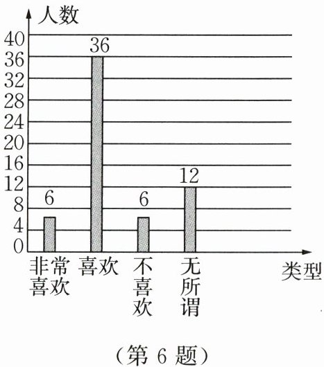 6. 某校数学教研组对七年级 360 名学生就“分组合作学习”方式的支持程度进行了调查,随机抽取了若干名学生进行调查,并绘制统计图(如图)。根据此统计图,估计该校七年级学生支持“分组合作学习”方式的有(非常喜欢和喜欢两种情况)(