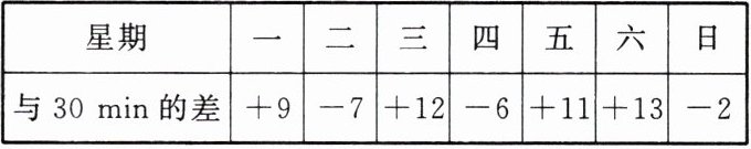 10. 小磊坚持跑步锻炼身体,他以$30\ min$为基准,超过$30\ min$的部分记为“$+$”,不足$30\ min$的部分记为“$-$”,将连续$7$天的跑步时间(单位:$min$)记录如下: