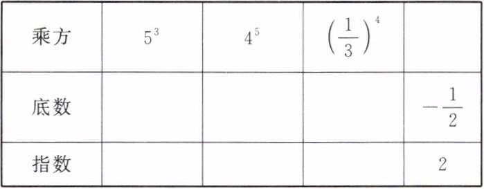 乘方 $5^3$ $4^5$ $\left(\frac{1}{3}\right)^4$ $\left(-\frac{1}{2}\right)^2$