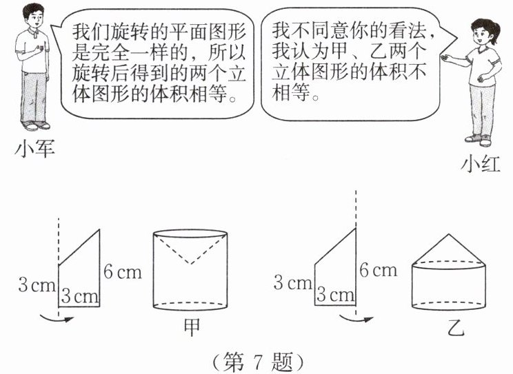7. 如图,小军和小红分别以直角梯形的上底和下底为轴,将梯形旋转一周,得到甲、乙两个立体图形。