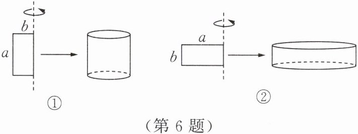 6. 已知长方形的长为$a$,宽为$b$。如图①,将这个长方形绕长边所在的直线旋转一周,得到的圆柱的侧面积是$S_{1}$;如图②,将这个长方形绕短边所在的直线旋转一周,得到的圆柱的侧面积是$S_{2}$,则$S_{1}和S_{2}$的数量关系是(