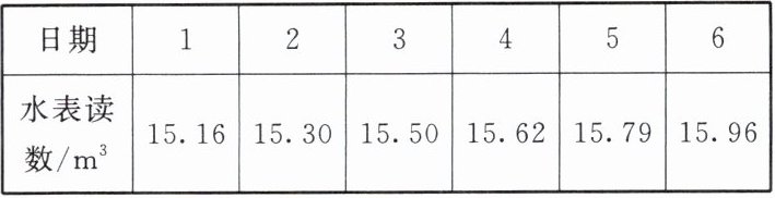 (2)$(0.16+0.14+0.2+0.12+0.17+0.17)÷ 6=0.16(m^{3})$。因此这6天的平均日用水量为$0.16m^{3}$。