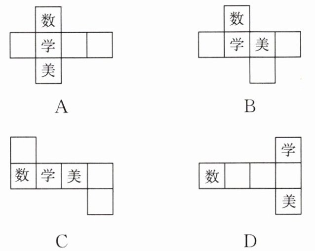 2. 如图,一个正方体的三个面上分别写着汉字“数”“学”“美”。若不考虑字的方向,则它的展开图可能是(