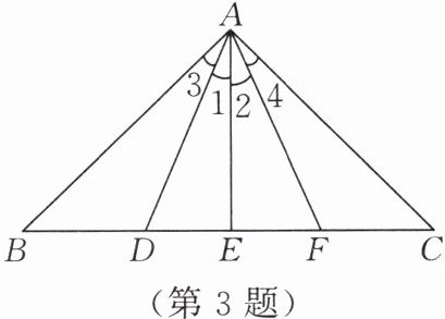 3. 如图,已知$∠1= ∠2$,$∠3= ∠4$,有下列结论:①$AD平分∠BAE$;②$AF平分∠EAC$;③$AE平分∠DAF$;④$AF平分∠DAC$;⑤$AE平分∠BAC$。其中正确的有(