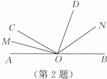 2. 如图,$∠AOB$是平角,$∠AOC= 30^{\circ}$,$∠BOD= 70^{\circ}$,$OM$,$ON分别是∠AOC$,$∠BOD$的平分线,则$∠MON$的度数为(