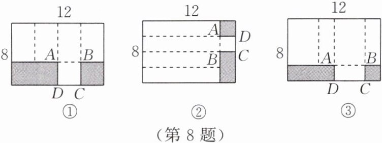 8. 【综合与实践】在数学活动课上,刘老师要求用长为12cm、宽为8cm的长方形纸片制作一个无盖的长方体纸盒。三个学习小组用下列方式在长方形纸片上截去两角(图中阴影部分),然后沿虚线折成一个无盖的长方体纸盒。