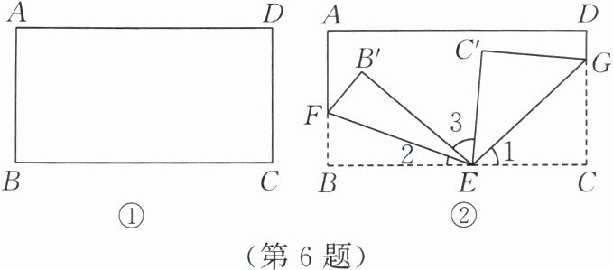 6. 【综合与实践】图①是一张长方形纸片ABCD。如图②,在边AB,BC和CD上分别取点F,E和G,连接EF和EG,并沿EF和EG折叠,使点B落在点B'处,点C落在点C'处。若$∠1= 42^{\circ},∠3= 56^{\circ},$则∠2的度数是