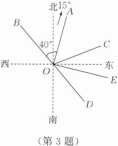 3. 如图,射线$OA的方向是北偏东15^{\circ}$,射线$OB的方向是北偏西40^{\circ}$。已知$∠AOB= ∠AOC$,射线$OD是OB$的反向延长线,则下列结论正确的是(
