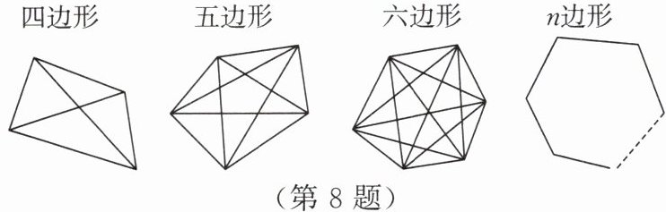 8. 【综合与实践】七年级数学活动小组在探究“$ n $ 边形($ n > 3 $)共有多少条对角线”时,画出如下的图形,应用得到的结果解决以下问题。