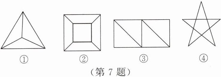 7. 【综合与实践】探究在封闭的平面图形中,图形的顶点数、边数(边指图中任意两点间的线段)和所分割成的区域数之间的数量关系。已知图①、图②、图③和图④,根据图形解决下列问题。