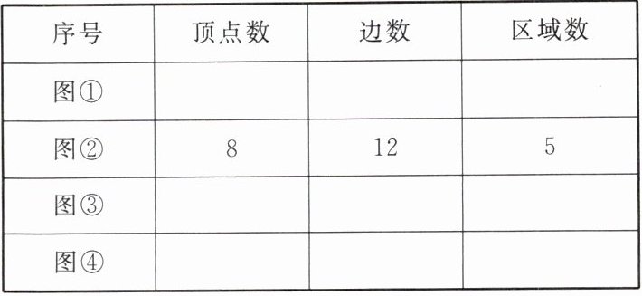 (1)数一数每个图形各有多少个顶点,多少条边,这些边围出了多少区域,并将结果填入表格中(图②已填好);