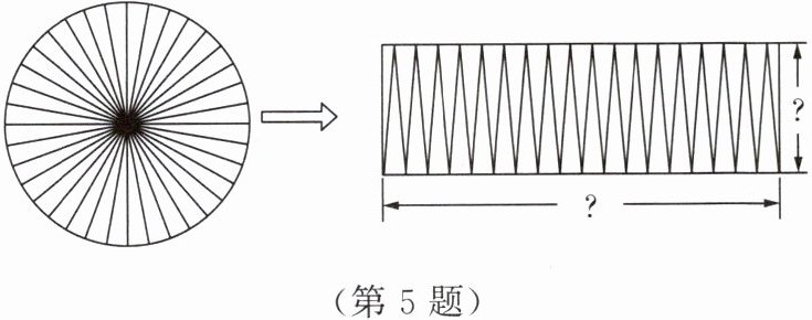 5. 转化是一种重要的数学思想方法。如图,在探究圆面积公式时,把一个圆先平均分成若干等份,再剪开拼成一个近似的长方形。那么这个长方形的长相当于圆的
