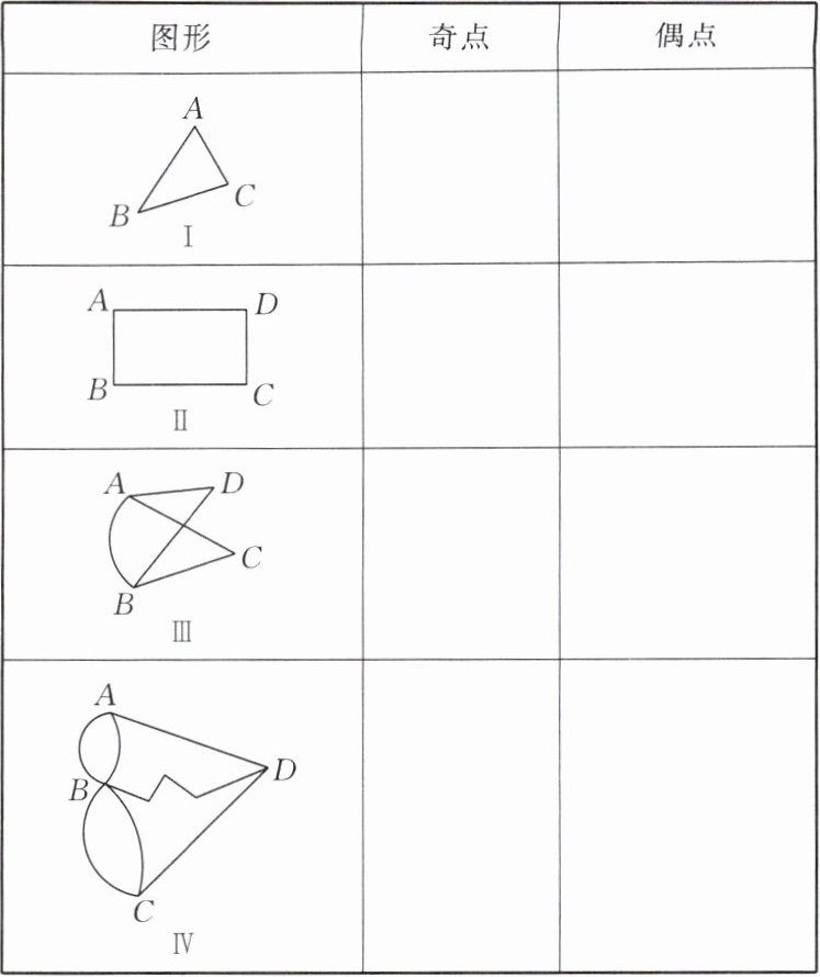 (2)①图形 奇点 偶点 Ⅰ 无 A,B,C Ⅱ 无 A,B,C,D Ⅲ A,B C,D 续表 图形 奇点 偶点 Ⅳ A,B,C,D 无 ②Ⅳ Ⅰ和Ⅱ ③Ⅰ,Ⅱ,Ⅲ Ⅳ 图略 发现:图形的奇点个数是0或2时能一笔画。