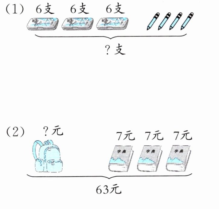 (1)3×6+4=22(支) (2)63-3×7=42(元)