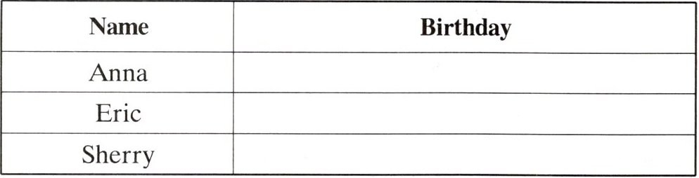 Name Birthday Anna 21st Oct. Eric 5th May Sherry 2nd Nov.